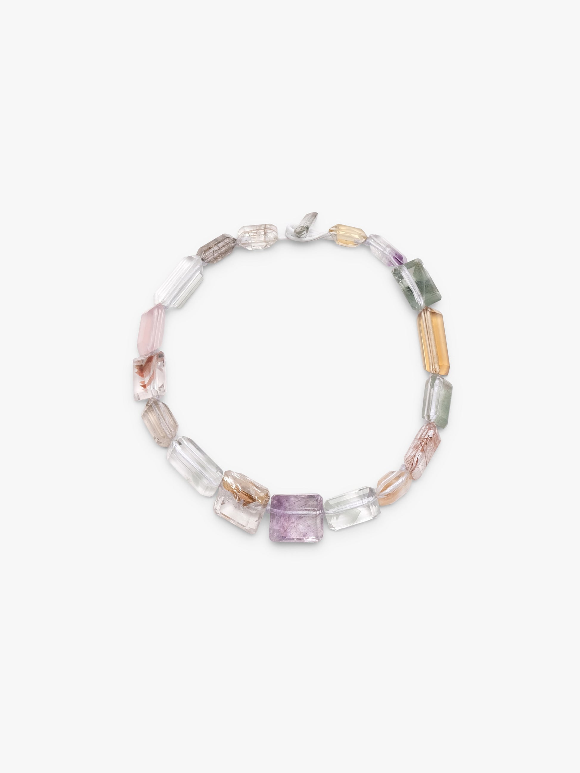 A spectrum of rare faceted stones forms this necklace, combining amethyst, citrine, rose quartz and rutilated quartz. Each stone is shaped with flat surfaces to reveal internal patterns, colour gradients and natural inclusions. The arrangement is irregular by design, letting each material stand on its own.